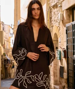 Jets Women’s Resortwear Dahlia Palm Embroidered Mini Kaftan – Chocolate | Chocolate
