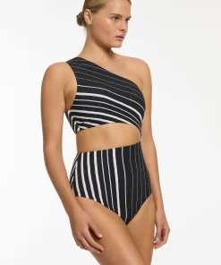 Jets Women’s One Piece Swim Lunar Stripe One Shoulder Cut Out One Piece – Black/chalk