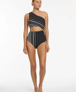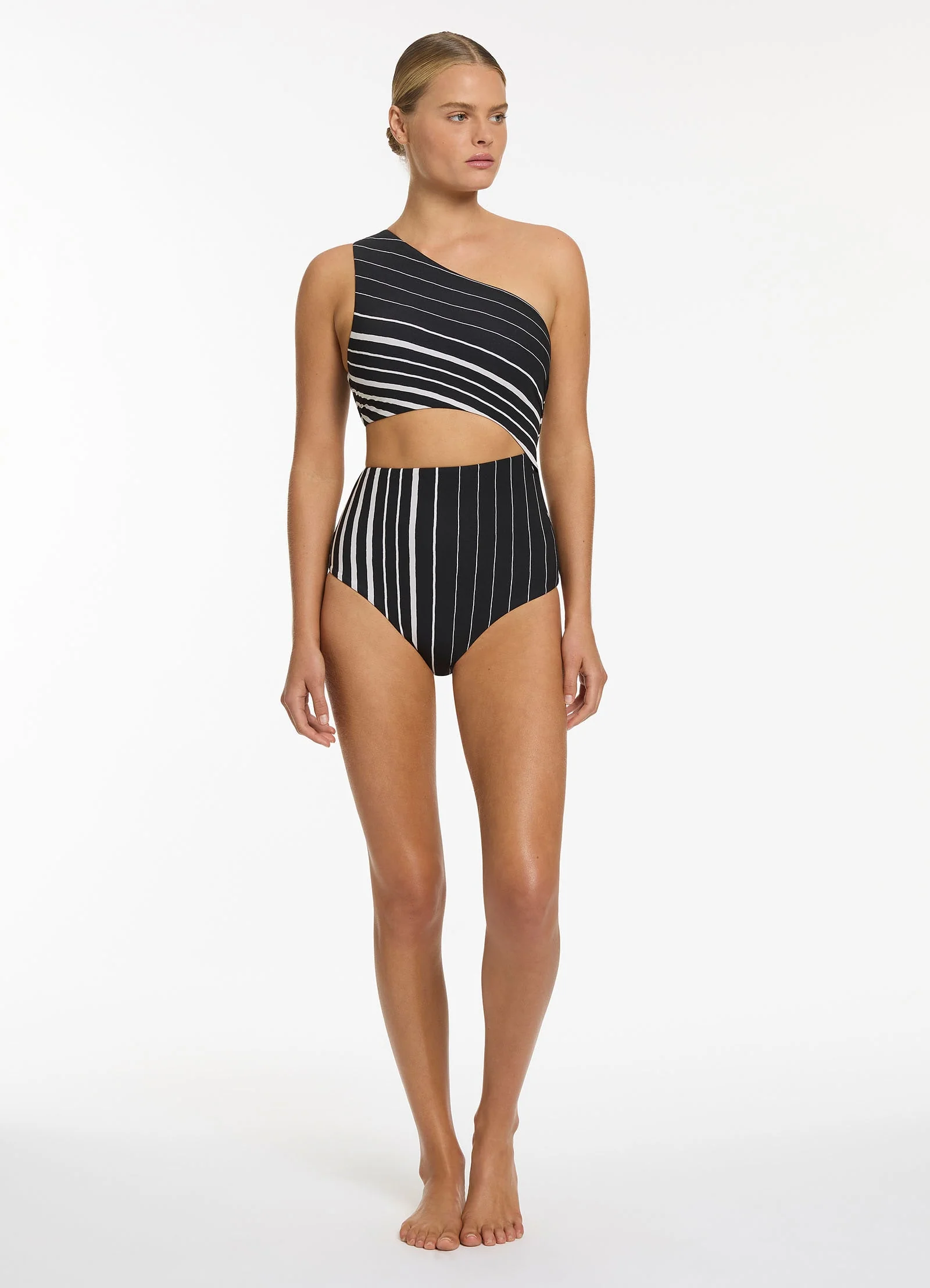 Jets Women’s One Piece Swim Lunar Stripe One Shoulder Cut Out One Piece – Black/chalk